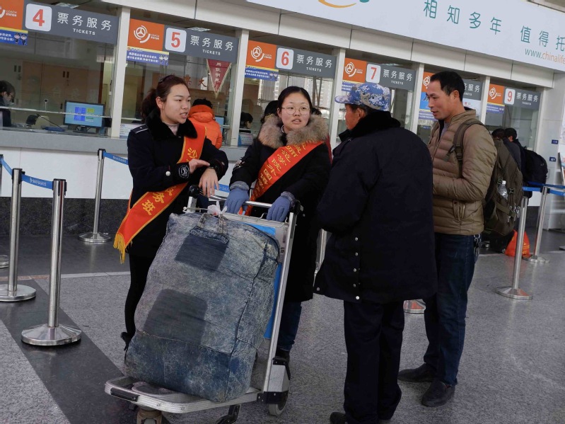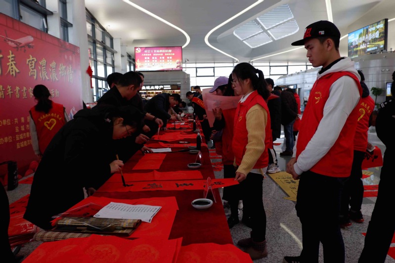 在盐城飞机场,志愿者们和机场工作人员共同举办了为旅客送福字活动,让匆忙而寒冷的归途充满融融暖意。志愿者们纷纷表示,通过志愿服务的形式来“参与春运、体验春运、服务春运”,既温暖了旅客的回家之路,也展现了青年志愿者的风采,感觉很有意义。