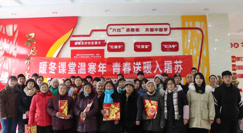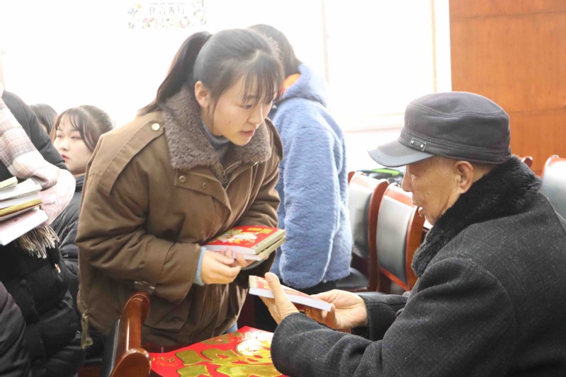 在通榆社区党员服务中心,志愿者们为社区老人带去了“中国年”文化小讲堂,用通俗易懂的语言讲述年的由来及中国年的传统习俗,给老人们送上了该学院青翼公益慈善服务中心募集的御寒冬衣,并送去福字、春联、台历等新年礼物,叮嘱他们要注意身体,春节期间户外活动要注意安全。