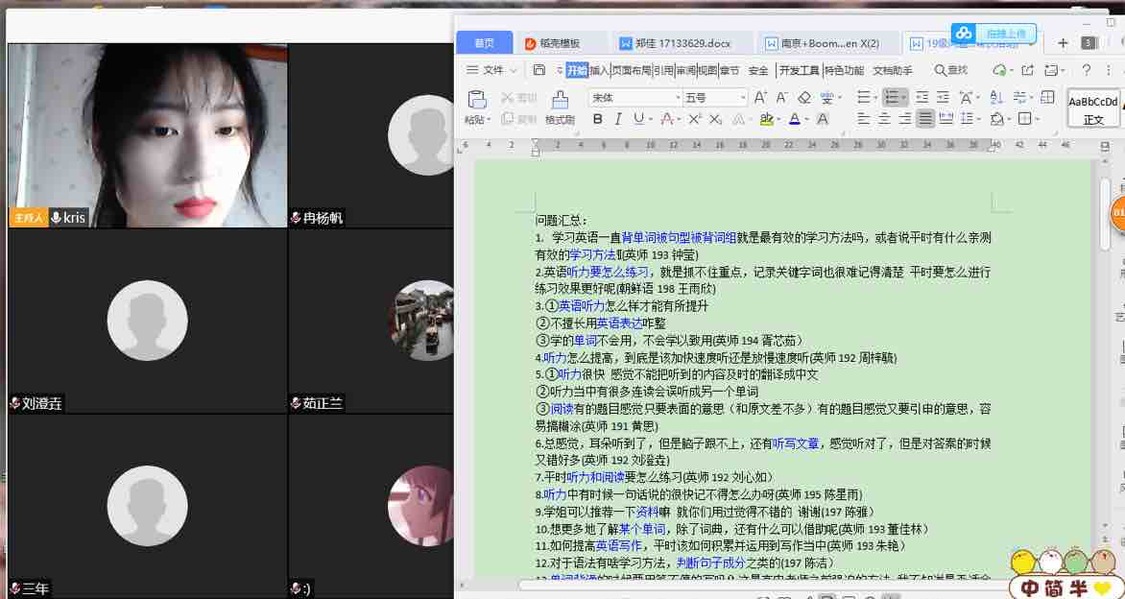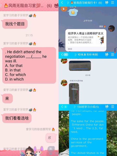 自学风“云建设”活动启动以来,学院号召同学们利用腾讯会议、QQ群、番茄“Todo”APP等平台,多渠道组建“云端自习室”和线上学习小组,邀请国家奖学金获得者、全国老员工英语竞赛一等奖获得者等学习榜样,开展以《专四ICU:完型+阅读主旨》、《英语学习:听说读写》、《考证那些事儿》为主题的线上答疑会、经验分享会,做好朋辈帮扶,营造浓厚学风,助力同学们尽快回归正常学习生活、摆脱学习困境、提高学习效率,以扎实的学业基础、饱满的精神状态迎接线下复学。
