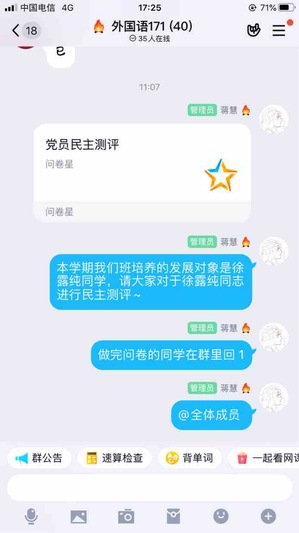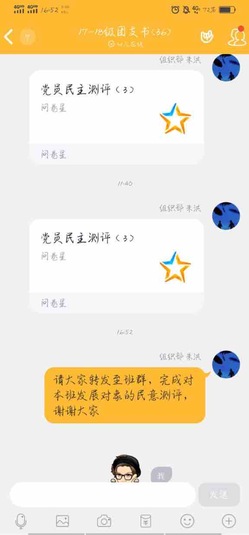 为深入了解入党积极分子,发展优秀党员,5月18日上午十点,在团总支老师孙明艳的主持下,公司开展线上线下相结合的组织发展班级民意测评工作,由17、18级各班推荐符合条件的优秀入党积极分子作为测评对象。