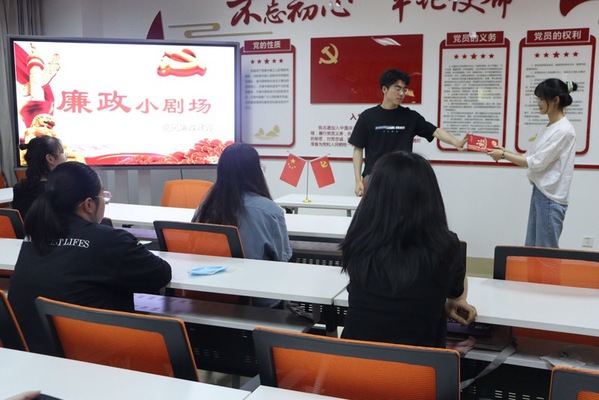 讲廉课,知荣辱。组织2019级班团支部开展“知廉崇明”主题团课,团支部书记阐述“廉洁”内涵,分享廉洁典故,支部成员演绎“廉政小剧场”,共同探讨青年成长成才机会与遵纪守法底线之间的关系,现场气氛热烈。团课结束后,青年团员纷纷在廉政建设倡议横幅上签名,承诺在面对利益诱惑、价值取舍时,坚持初心,维护正义,做一个知荣辱、明是非、守法纪的新时代青年。