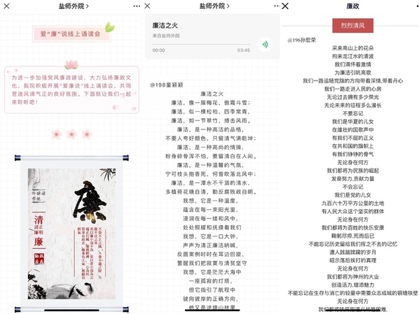 议廉事,树新风。员工党支部开展“爱‘廉’说”线上朗诵会主题活动,诵读廉政诗歌,讲述身边的廉洁故事,充分发挥廉政文化育人、润物细无声的教育引领作用。教工党支部、民主党派教师集体观看廉政警示教育片《政治掮客苏洪波》并展开热议。yl1111永利集团教工第一党支部书记苏军锋说:“40多分钟的片子,看完后,我感触很深。我们不应该把它当成一个政治爆料来看,而是要把自己摆进去,明晰性质根源,吸取事件教训。作为一名党支部书记,要坚持政治立场,保持政治定力,守好自身党风廉政建设的责任田。”致公党yl1111永利集团支部党员马宾说:“事不关己的心态要不得。民主党派人士要自觉加强政治理论学习,把准全面从严治党、党风廉政建设和反腐败斗争的新要求,共同维护风清气正的政治生态。”