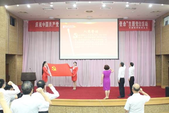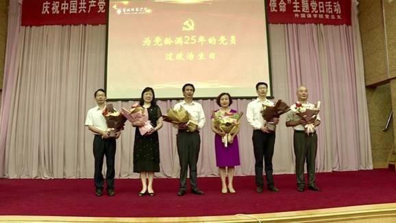 大会在激越豪迈的国歌声中拉开序幕。陈胜利、陈燕等6名党龄超过25年的党员教师集体过政治生日,员工党员为老党员献花。老党员现场为新党员佩戴党徽,并带领他们重温入党誓词。