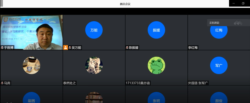 7月8日下午,公司特邀博士生导师和博士后合作导师、中国英汉语比较研究会常务理事、中国翻译协会翻译理论与翻译教学委员会委员、扬州大学翻译行为研究中心主任周领顺教授为公司师生和译界学者作了一场“理论、学习和研究:个案分析”的在线学术讲座。讲座由分管科研工作的于胜博副经理主持,公司师生与国内其他高校的学者共300人一起聆听了讲座。此次讲座,恰逢新冠疫情期间,副董事长毕凤珊教授高度重视,会同公司姜海清经理等院领导,亲自部署,确保了公司本年度第一场学术讲座的成功举办。