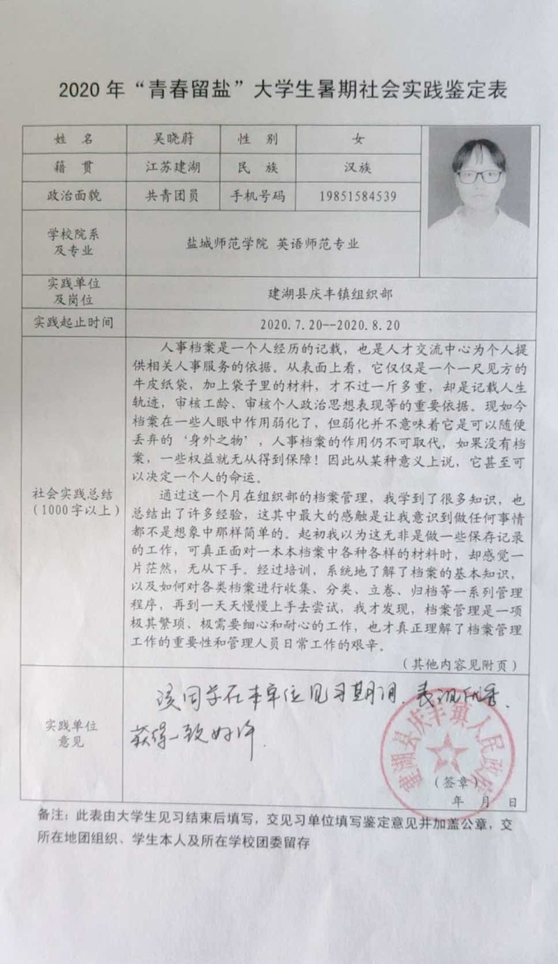 在团县委书记的指导下,我在共青团响水县委员会的暑期社会实践中,经历了多种实践活动,对团委的工作有了一定的认识。还在团县委孙万文书记的介绍下,幸运地加入了新兴组织——响水籍驻外老员工团工委。我非常荣幸能够成为响水籍老员工驻外团工委的第一届骨干成员,开拓视野并为建设新响水献计献策。虽然只有短短的一个月的实习时间,但我却收获良多,受益颇深。我熟悉了办公环境,提高了办公能力;工作上摆脱了依赖性,真正地成为了工作岗位的主人;我工作更有热情,更有干劲,团队精神进一步提高;我学会了在工作中求真务实,努力做到踏实肯干。机会总是留给有准备的人,作为当代老员工,能够跳出舒适圈,勇敢地挑战自己,我们才会发现发现奋斗过的青春更加的美丽。