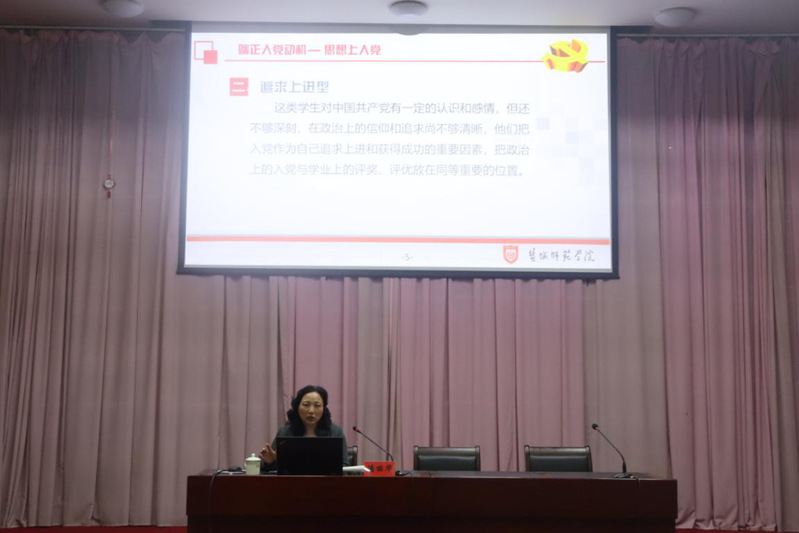潘丽华从思想、行动和组织三方面入手,阐明了以实际行动争取加入共产党的必然要求。第一,端正入党动机,在思想上入党。通过分析崇高信仰型、追求上进型、盲目从众型和功利实用型四种入党动机,她强调,崇高信仰型是完全正确且理应具备的。第二,践行党员标准,在行动上入党。入党积极分子须明确并跟从入党的申请条件、党员的基本条件及党员的义务与权利三大标准。第三,履行入党手续,在组织上入党。她详细阐释了入党的完整过程和严密手续,鼓励入党积极分子提高综合素质。最后,潘丽华向在场入党积极分子寄语,预祝他们早日加入中国共产党。