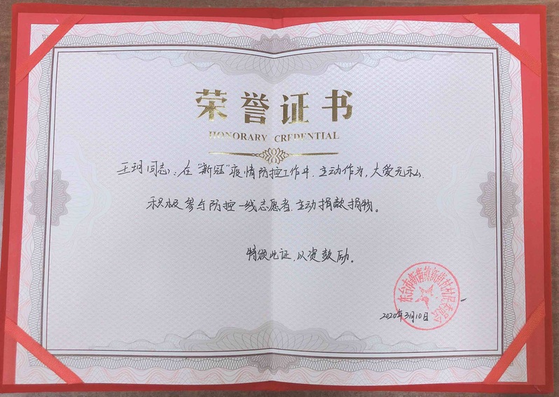 王玥同学用实际行动描绘了中国人众志成城、万众一心的抗疫图腾,彰显了她极高的社会责任感和爱国担当,为一线战疫传递了爱与温暖,为决胜这场疫情防控阻击战增添了信心。
