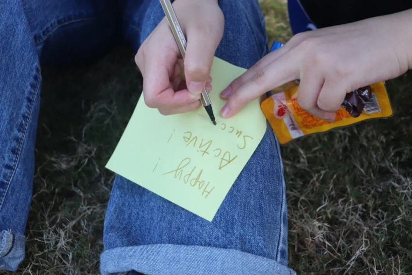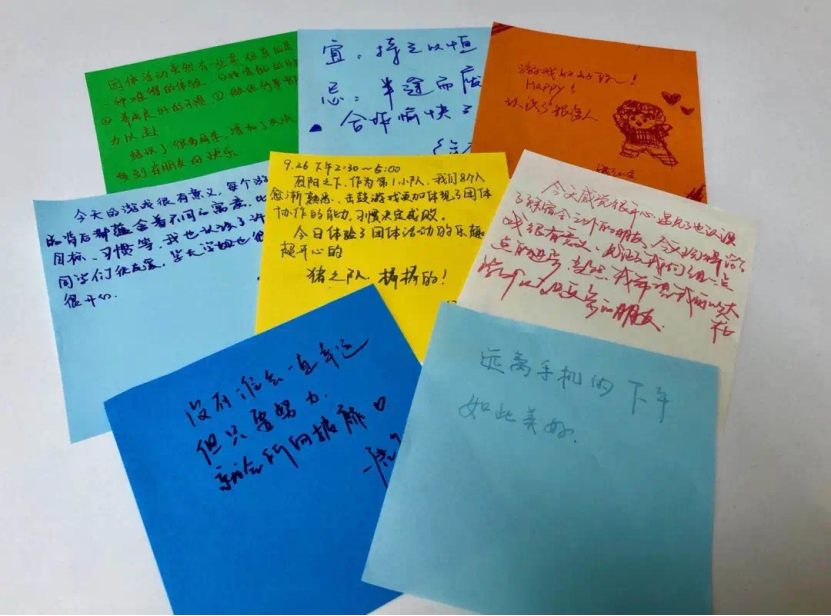 每位同学在彩纸上写下感悟及期望。此次团体辅导活动不仅帮助新生们彼此熟悉,增强集体荣誉感,更是通过设计的系列沉浸体验式游戏帮助他们认识到尽早树立学习目标,养成良好学习习惯,为目标全力以赴的重要性。
