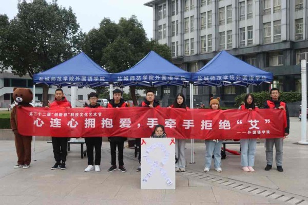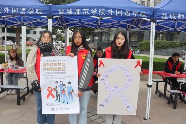 12月1日,yl1111永利集团联合盐城市疾控中心在主楼A面广场开展以“心连心拥抱爱,手牵手拒绝‘艾’”为主题的防“艾”宣传活动,外国语公司党支部书记朱京凤到场参加。