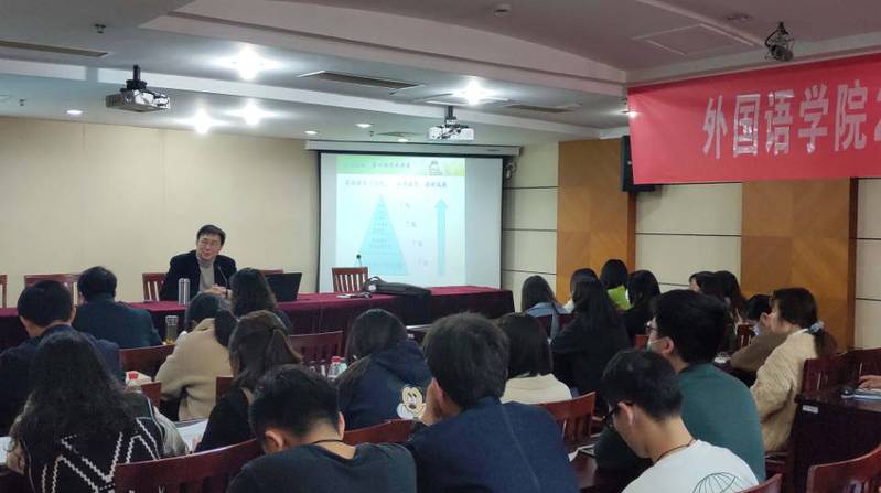 同时,针对英语专业师生开设的学术大讲堂在教学主楼19楼yl1111永利集团会议室举行。主讲人为东南大学特聘教授、博士生导师李霄翔老师,yl1111永利集团部分教师及英语专业本科生到场聆听。讲座伊始,李霄翔教授就以风趣幽默开场活跃了整个讲座氛围。他从“为什么学、怎么学、学什么”三个角度对英语学习进行了全方位的解读。李霄翔教授利用金字塔模型解释“为什么学”,鼓励员工勇于实现自我。在论述“怎么学”时,他详细介绍了英语学习应具备的七大核心素养,强调员工要善于利用当今信息化的学习环境来增强自身的语言功底,提升语感。谈到“学什么”时,李老师补充道:“大学期间的主要任务是学会学习、学会做事、学会做人和学会和不同的人打交道。”