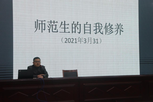 唐华结合自身从教近二十年的经历和经验从“眼界”、“品行”、“学识”、“定位”几个方面,分享了多年教书育人的心得。唐华指出,每个人的“修养”并非与生俱来,它需要我们后天去不断的培养自己高尚的品质、拥有正确的处世态度、完善自身的行为规范。作为新时代的未来教师,首先要通过阅读和实践去拓宽眼界,学会看世界、看教育、看教师。了解当前基础教育关注的基础性、应用性、综合性和探究性。在平时的学习中要,增强自主学习的意愿、提高自主学习能力、提高自我学习的成效。在平时的生活中要不断完善自我品行,拥有谦和的言行举止、仁善的内心世界、包容的处事态度、坚定的政治立场。他勉励在场同学,要牢记为党和人民教书育人的初心,从现在开始做好自己的生涯规划和职业规划,珍惜宝贵的大学时光,抓住锻炼自我的机会,为成为一名光荣的人民教师而努力。