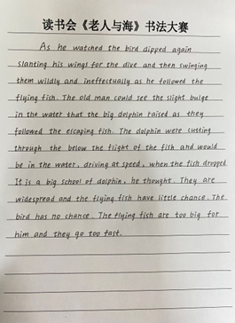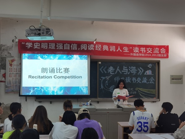 英语第九读书会进行了师生交流活动与阅读分享。徐晓燕老师从书籍简介入手,深入浅出地介绍了《老人与海》的相关知识;她谈到“授之以鱼不如授之以渔”,培养员工良好的思维品质和学习习惯尤为重要。后也进行了书法比赛和朗诵比赛。最后,为了检测同学们的阅读成果,第九读书会展开了知识竞赛活动。