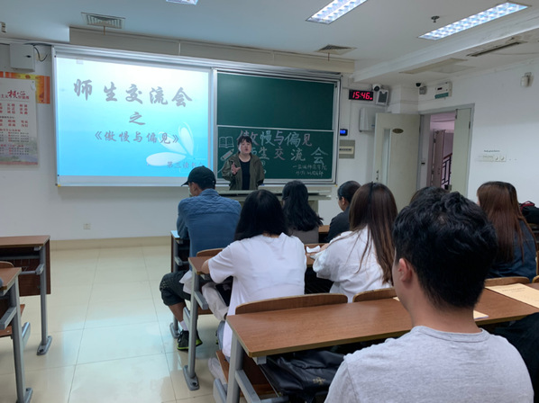 由193和203团支部组成的第三读书会开展了由英语专业老师杨芳主持的“师生对话交流”读书分享会。杨芳老师以《傲慢与偏见》为例,给大家分享了阅读经验并给大家指导了阅读方法。