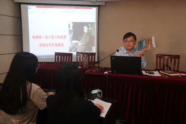 范经理以作者加兰早年就离开家庭到东部闯荡,没能很好的照顾留在西部农场的家人的个人背景为引,从不同角度为我们讲述了四类风格迥异的西部女性形象代表。接着,从美国西部的文化和现实价值两方面引导同学们共同来阐发《大路条条》的典范意义,并指出了《大路条条》对女性社会地位、地缘文化差异等的思考具有感化作用。最后,范经理本着“常读常新,好书多读”的理念,推荐同学们闲暇时可以阅读他本人创作的《现实的背叛者 艺术的追求者》,鼓励同学们换角度看问题、深入了解美国西部文化。