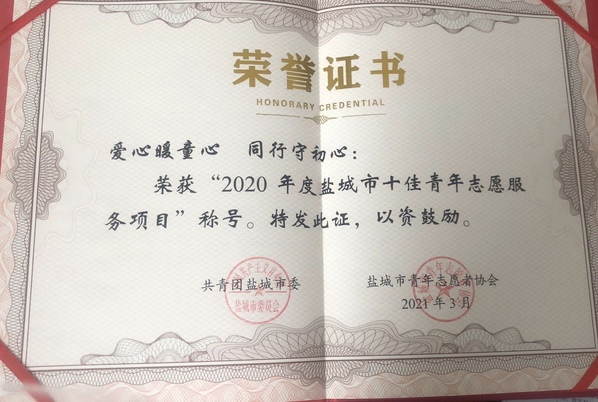 近日,共青团盐城市委、盐城市青年志愿者协会公布了《关于公布2020年度盐城市优秀青年志愿者、志愿服务项目、志愿服务行动组织奖的通知》,yl1111永利集团“爱心暖童心,同行守初心”志愿服务项目荣获“2020年度盐城市十佳青年志愿服务项目”称号。
