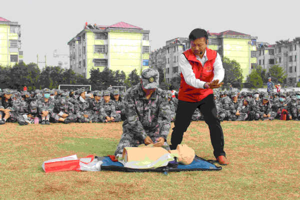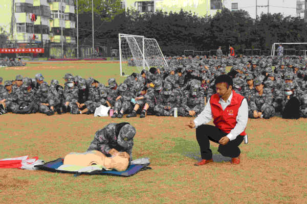 急救演练中,红十字会的志愿讲解员热情耐心地为同学们讲解急救知识,为新生们解答各种急救问题。首先,他强调了救人“黄金四分钟”的重要性,趣味横生的讲解让同学们很快了解并掌握了“评估环境”、“识别判断”、“高声呼救”、“仰卧”、“胸外按压”的五步急救流程。接着,他对是否需要急救、胸外按压姿势、按压频率等急救细节进行重点讲解,同学们认真观摩并学习。在讲解员的带领下,大家对急救的基本技能都有了较为充分的认识,不断有同学勇敢上前,对着橡胶人偶进行模拟操作演练,讲解员给予纠正与鼓励。