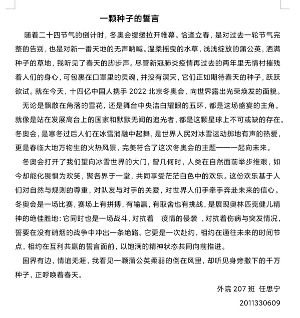 在“同心筑梦迎冬奥”主题征文比赛中,外院学子们用文字为冬奥喝彩,用最真诚热烈的话语表达对冰雪勇士们敬意与支持,同时发挥青年独有的视角与思考,抒发感悟,展望未来,为冬奥精神注入新的内涵。