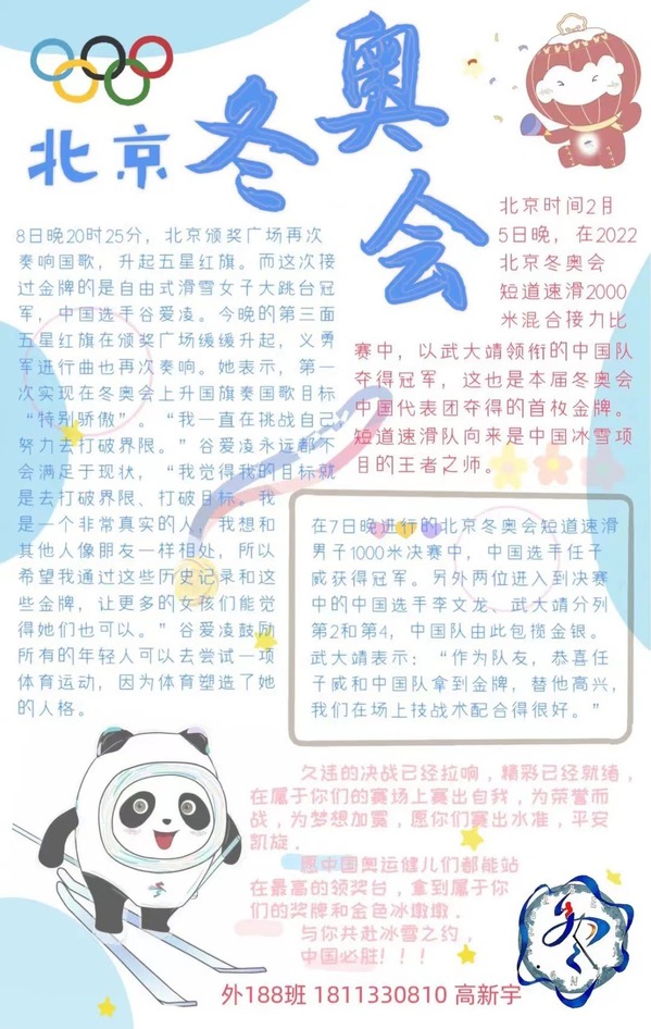 在“冰雪神州观冬奥”为主题的迎冬奥手抄报征集活动中,外院学子们发挥创作灵感,秉承团结友爱、公平竞争的奥林匹克精神,用画笔描绘出心中的冬奥盛会,一撇一捺都承载着对东奥的期盼与祝福。