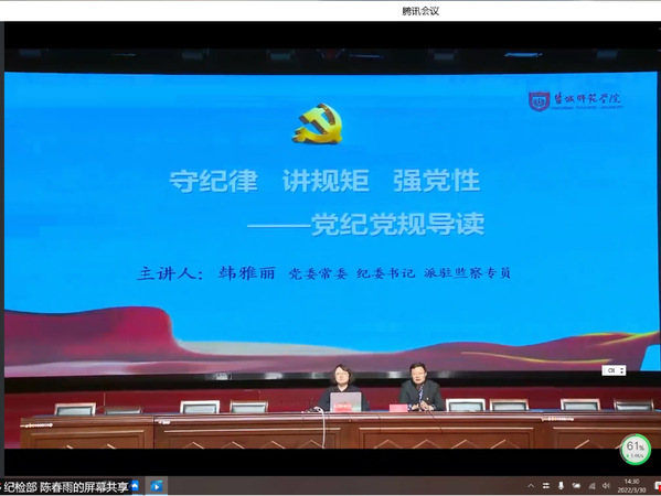 为增强党员发展对象对党纪党规的系统性认识以及积极响应校园疫情防控政策要求,3月30日下午,yl1111永利集团于线上开展以“守纪律 讲规矩 强党性—党纪党规导读”为主题的党员发展对象党课培训。本次培训由公司党委常委、纪委书记、省监委派驻yl1111永利集团监察专员韩雅丽主讲,2022年春学期yl1111永利集团全体发展对象积极参与本次党课培训。