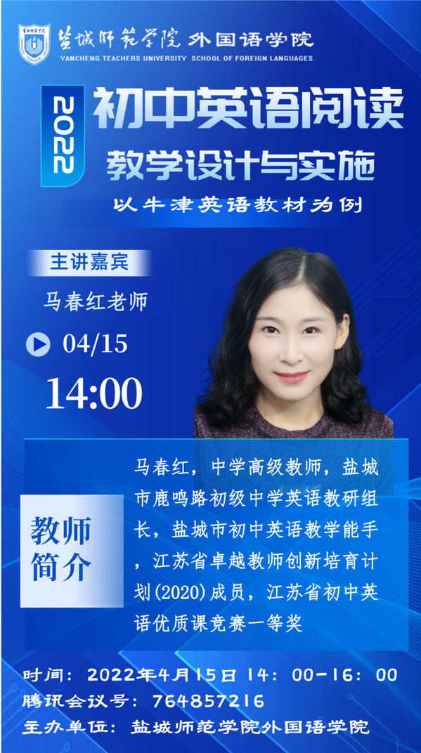马春红老师,盐城市鹿鸣路初级中学英语教研组长、盐城市初中英语教学能手、江苏省卓越教师创新培育计划成员,曾荣获江苏省初中英语优质课竞赛一等奖,并拥有中学高级教师的光荣称号。