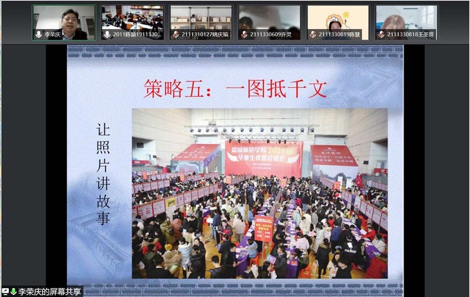 李荣庆以《二级学院新闻宣传策略》为题,结合自身多年新闻宣传工作经验,从公司媒体矩阵、宣传路径、宣传策略三方面着眼,为在场师生带来了一场精彩纷呈、干货满满的讲座。他表示,新闻宣传工作要培养“新闻眼”,准确把握宣传力度,挖掘有温度、有深度的新闻。他强调,在新闻宣传过程中,一是要注重宣传内外有别;二是要善于发现新闻价值,注重事实和时效;三是要注重新闻六要素,让新闻生动起来;四是要让新闻更有深度,挖掘新闻背后的规律和故事;五是学会让照片讲故事,通过清晰、动感、动人、创意的照片,让观者眼前一亮,提升新闻宣传效果。
