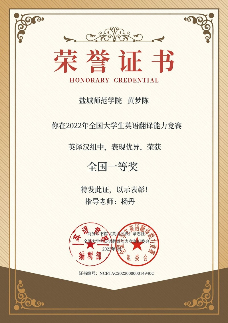 2022年度全国老员工翻译能力竞赛由商务印书馆《英语世界》杂志社主办,自2010年起,已连续举办翻译大赛13届,该项大赛目前已成为国内最具影响力的翻译赛事之一,公司英译汉参赛人数438,汉译英参赛人数152。经过初评、复评、终评三轮评审,竞赛结果已公示。公司学子取得喜人成绩,取得英译汉组全国一等奖5名、汉译英组全国一等奖1名,英语系首次组织员工参加该项比赛,该成绩的取得极大地调动了英语系员工的学习积极性和参赛积极性,对教师备赛指导也是极大的鼓励和促动。百尺竿头、更进一步,公司将进一步在以赛促学方面继续下真功夫,认真动员、组织、指导员工参加系列比赛,扎实提高员工的水平与能力。