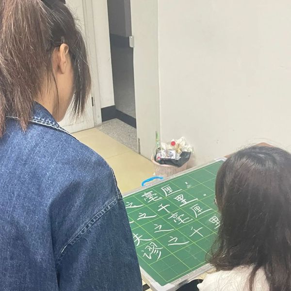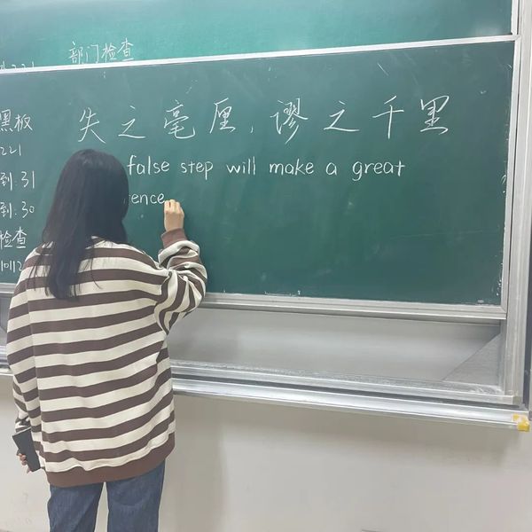 教学结束后,新生们便开始进行中、英文书写练习。高年级授课同学走下讲台,认真耐心地指导新生们。看到精彩的字便微微颔首以示肯定,看到不足之处也耐心指导,帮助同学们不断完善自己的粉笔字技能。活动最后,各班由授课人选出优秀书写作品给予表扬和加分,其他同学也鼓掌表示称赞。