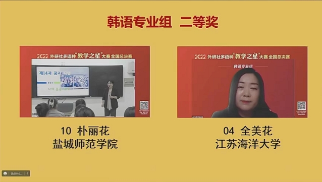 2022年12月17日8:20-12:20,由北京外国语大学中国外语与教育研究中心、北京外国语大学中国外语教材研究中心、外语教学与研究出版社主办的多语种“教学之星”大赛韩语专业组全国总决赛成功落下帷幕,我系朝鲜语专业教师朴青梅获韩语专业组全国总决赛一等奖,朴丽花获二等奖。