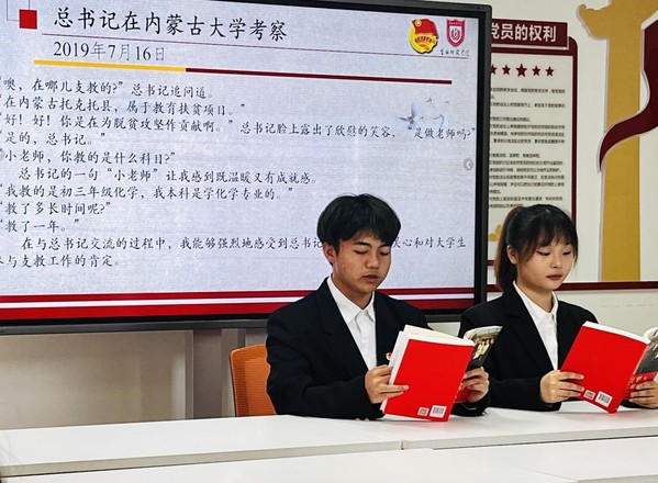 主持人介绍了党对新时代青年工作的引领作用,并对总书记的考察过程做了生动讲述。其中,总书记对广大学子的殷殷嘱托鼓舞了同学们,大家由此展开了热火朝天的讨论。最后,主持人播放一段视频,并激励同学们把所学知识内化于心,外化于行,担当社会责任,为祖国的繁荣发展不懈奋斗。