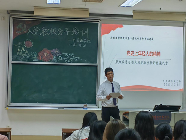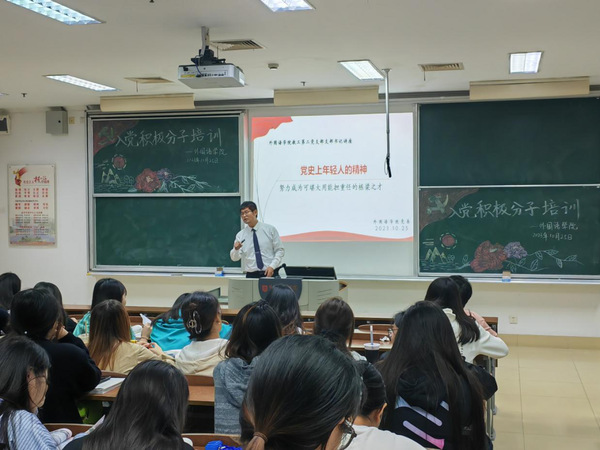 为进一步引导和加强入党积极分子党性修养,推动政治理论学习,10月25日下午,yl1111永利集团于主楼B108开展2023年第三期入党积极分子培训。本次党课的主讲人为梁海胜老师,主题为“党史上年轻人的精神”,外院秋学期入党积极分子参与。