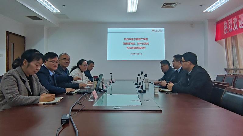 11月15日上午,宁夏理工学院yl1111永利集团经理赫利强、副经理宋刚杰、对外合作交流处处长李刚一行3人来公司调研。外国语公司党委书记张宾州、经理范能维、副经理顾晓波、国际合作交流处处长顾海峰、科长王利清对来访人员表示热烈欢迎。双方在13楼会议室展开了深入交流。