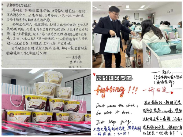 研途漫漫,从不孤单。yl1111永利集团在考前为全体考研学子准备了“一举夺魁”考研暖心加油包——精致的贺卡寄满祝福、美味的德芙巧克力补充能量、考研必备文具作充分保障,为大家稳心态、增信心、添动力,相信每位学子都能在这份考研大礼包中感受到学院和老师们美好的祝愿和亲切的关怀。同时,学院的毕业生和在校生都为考研同学的最后冲刺加油打气。