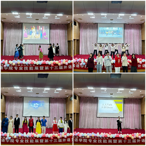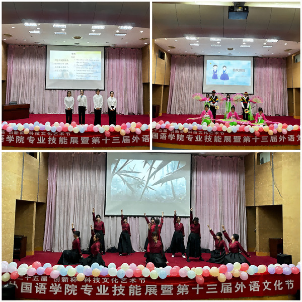专业技能展以外院各专业特色为依托,多语种荟萃,亮点频出。开场节目《花木兰》英姿飒爽,利落整齐的舞蹈让观众感受到外院学子“巾帼不让须眉”的气概;话剧《诗译人生》娓娓道来,将观众带进翻译泰斗许渊冲先生绝美的浪漫翻译文学世界;朝鲜族民间舞蹈《象帽扇子舞》典雅含蓄,动作优美;《琴韵书法》聚焦传统,将粉笔字书法搬上舞台,展现外院学子扎实的教学基本功;活动最后在大合唱《相亲相爱》中落下帷幕,观众掌声久久不息。
