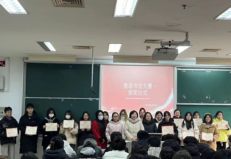 比赛结束后评委们经过一番激烈的评选,共评选出一、二、三等奖共15位同学。并于2024年1月10号举办俄语书法大赛颁奖仪式。俄语系主任王晓军带领全体教师出席了颁奖仪式。