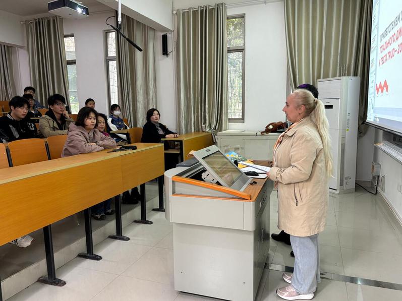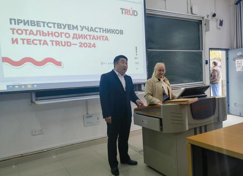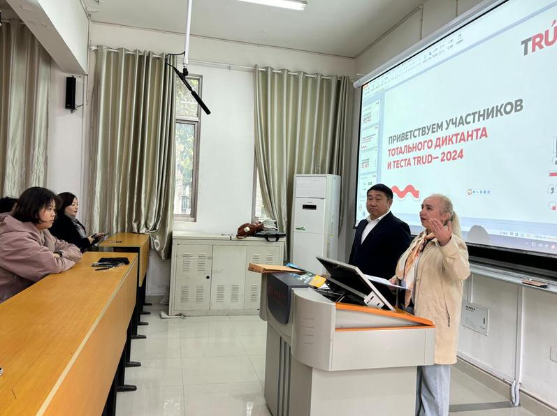 于经理和此次俄语“全民听写”yl1111永利集团分考场活动组织者——维多利亚外教在活动一开始向全体师生介绍了本次活动相关内容和具体事宜。全民听写活动作为俄罗斯的公益教育项目,始于2004年,由俄罗斯全民听写基金委发起,各地学校承办,每年统一举行一次,旨在提高俄罗斯国民的俄语语言水平,测试所有掌握俄语人士(俄语学习者)的语言水平和强调语言的规范性,听写内容多语节选自俄罗斯著名作家的经典文学作品。