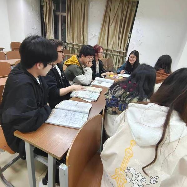 活动中,同学们被分为三组,韦家敏学姐担任学业帮扶导师,通过问题辅导、答疑解惑等互助方式,为需要帮扶的员工梳理知识点,总结英语各类题型的答题思路,改进学习方法,分享解题技巧。此外,朋辈帮扶进宿舍,同楼栋的学姐学长点对点、一对一地提供生活和学习指导、大家在宿舍一起研讨问题、交流心得。