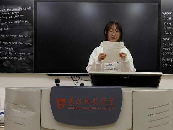 “诵读青年信仰,书写青春诗篇”主题活动分为诵读和书写黑板字两个部分。诵读环节中,外院学子用英语、法语、俄语等语言诵读经典文学作品,丰富的情感和抑扬的语调让听众们沉浸其中,文学的魅力由此彰显。黑板字环节中,师范专业同学们展示了自己遒劲有力、工整清秀的板书,一笔一划都印刻着他们扎实的教学基本功底。