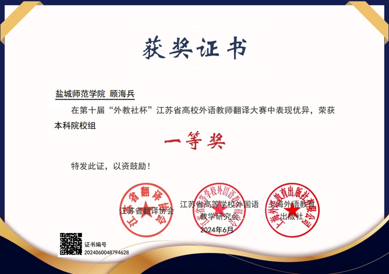 6月7日,第十届“外教社杯”江苏省高校外语教师翻译大赛圆满落幕,公司顾海兵老师凭借扎实的专业功底和出色的翻译能力,荣获一等奖。
