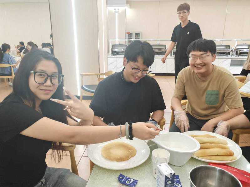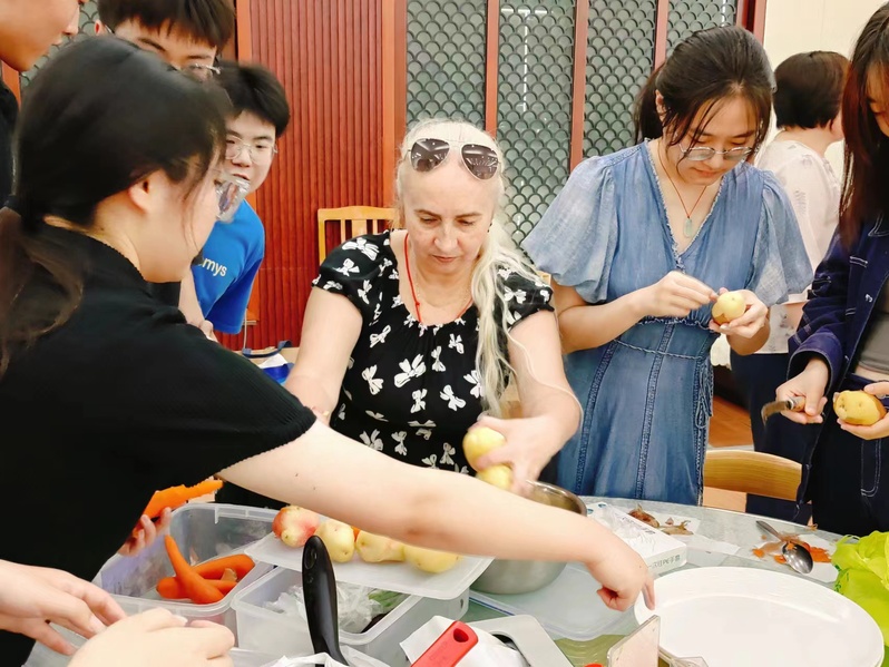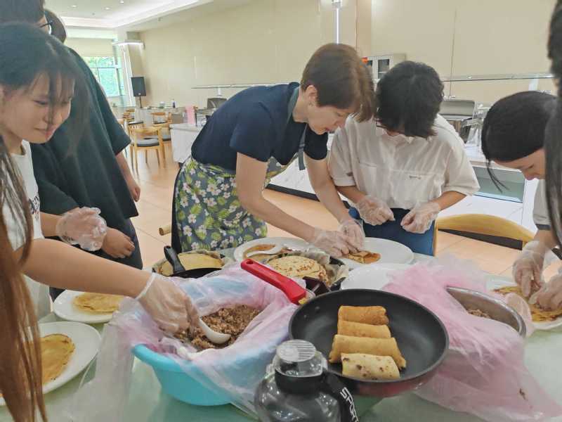 同学们饶有兴致地向外籍教师学习做薄饼、红菜汤、薄饼卷猪肝米饭及俄罗斯沙拉等特色美食。从食材准备、切配食材,到烹饪、装盘摆饰,同学们都积极地全程参与。下午五时,“俄罗斯美食节”在师生们分享完亲手制作的美食,打扫好卫生后,于余兴未尽中徐徐落下帷幕。