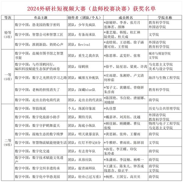 公司校赛分为两个阶段举行:初赛与决赛。经评审,本次校赛最终评选出特等奖3组,一等奖5组,二等奖9组,三等奖24组。荣获校赛特等奖的三个团队将在接下来的省赛准备中继续发扬盐师人不怕苦、不怕累的顽强拼搏精神,在省赛中发挥出水平,用短视频形式讲好“数字中国”故事。