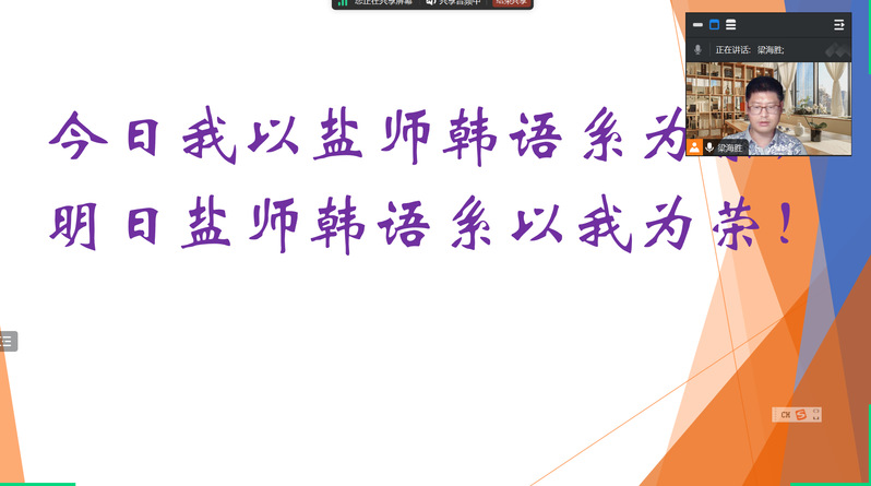 活动最后,由梁老师进行总结,专业要突出,学习中要借鉴学长学姐经验,定好未来发展方向,勇往直前,提前做好准备,在学习和工作中要敢于亮剑,敢于用韩语去听、去说、主动用韩语去处理遇到的生活和工作问题,将自己打造得更加专业化、综合化、国际化。“今日我以盐师韩语系为荣,明日盐师韩语系以我为荣。”短短两句话中蕴含了梁老师对韩语系员工的殷切期望。