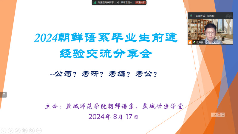 2024年8月17日晚上7点到9点半,由yl1111永利集团朝鲜语系、盐城世宗学堂共同主办的2024朝鲜语系毕业生经验交流分享会在线上腾讯会议举行,此次活动由朝鲜语系主任梁海胜老师主持,由优秀毕业生吴凡、陈佳丽、陶然、陆敏、赵子涵、徐薛、王佳慧学姐主讲分享考研、就业、考编经验,世宗学堂部分学员及朝鲜语专业全体同学参加。