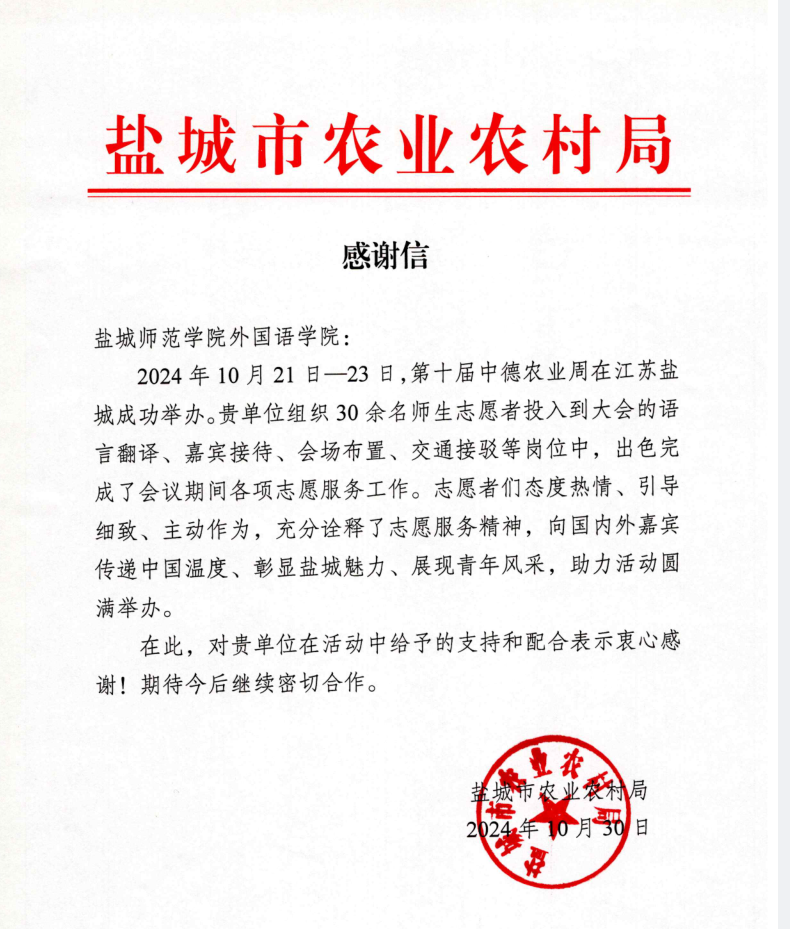 2024年10月30日,盐城市农业农村局给公司发来信函,对于公司师生在“中德农业周”活动期间做出的努力和贡献表示感谢!