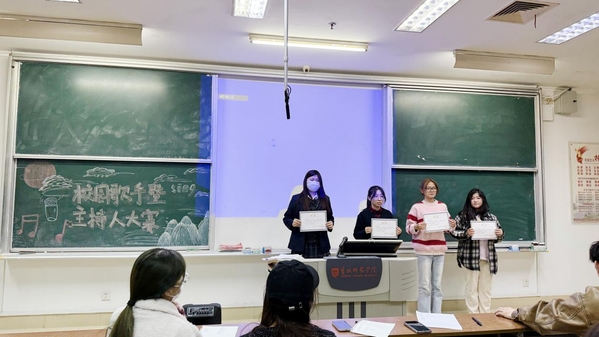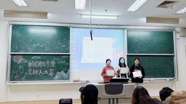 接下来是校园歌手大赛,决赛现场上,12名演唱选手纷纷拿出自己的拿手金曲,给观众带来一场精彩绝伦的视听盛宴。比赛开始,各位选手依次上台亮相,《九张机》、《不为谁而作的歌》、《How far I’ll go》等歌曲。选手们在舞台上尽情发挥,将感情融入歌声,时而轻柔婉转,时而激昂高亢。选手们声入人心,博得现场观众连连叫好,整个教室被热烈而激动的氛围填满。这里是赛场,更是青春的舞台。