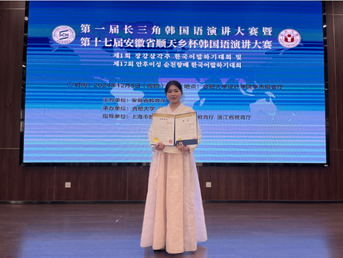 2024年12月5日,由上海市教育厅、江苏省教育厅、浙江省教育厅指导,安徽省教育厅主办,合肥大学和顺天乡大学承办的“第一届长三角韩国语演讲大赛暨第十七届安徽省顺天乡杯韩国语演讲大赛”在合肥大学成功举行。公司朝鲜语专业石丽同学大展风采,脱颖而出,收获颇丰,获三等奖。