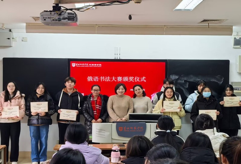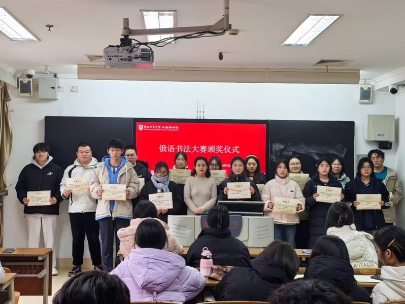 在颁奖环节,获奖的同学们带着喜悦和自豪的心情走上领奖台,在颁奖仪式上,俄语系主任王晓军老师对获奖同学表示了热烈的祝贺,并鼓励获奖的同学继续努力,不断提升自己的俄语书写水平。