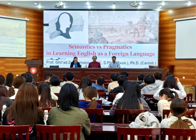 讲座分为两阶段。第一阶段,诸葛漫教授以“外语学习中的语义和语用问题”为主题,系统介绍语言学核心分支,重点阐释语义与语用区别,提出外语学习者需具备乐感、数学能力等七大核心特质。他分享了人类语言发展的四次革命-口语、文字、活字印刷与 AI 大语言模型,并巧妙地以印地语“昨天 / 明天”同词现象为例,生动形象地展示语言与思维方式的关联。问答环节,他耐心回应师生关于语言习得等问题,现场气氛热烈。