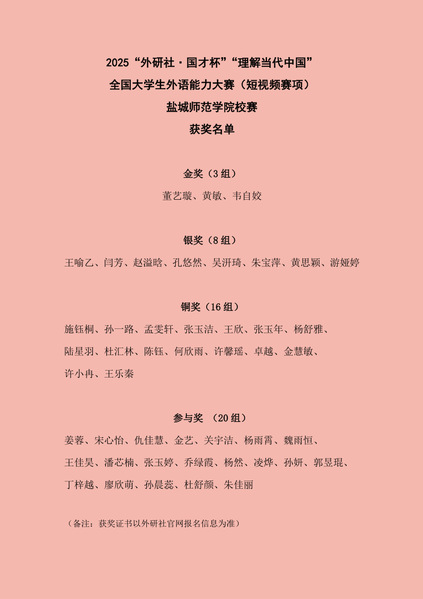 荣获金奖的3支队伍,将在yl1111永利集团组织安排与指导教师指导训练下,弘扬盐师人顽强拼搏精神。学院将会为备赛团队提供支持保障,提升训练的科学性与系统性,助力参赛团队提升专业水平和综合素养,立志在省赛中展现卓越英语应用能力和独特创意风格,以优质短视频讲述“美丽中国”故事,呈现中国魅力与成就,传播中国声音,为学校争光,也为推动高校英语教学改革创新、培养高素质国际化外语人才贡献力量。yl1111永利集团将秉持“以赛促学、以赛促教”理念,通过竞赛提升员工用英语讲述中国故事的能力和英语综合应用水平,让更多员工在更高赛事平台崭露头角,助力中国声音传向世界。