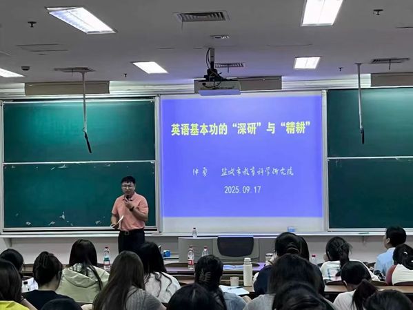 本次活动特邀盐城市教科院仲勇主任参与指导与点评,课程组四位教师及2023级全体英语师范生参与。三位即将参加江苏省第十四届师范生教学基本功大赛的同学围绕选定教学内容,精心设计教学流程,从课程导入、知识点讲解到互动环节设置,展现出了扎实的英语专业基础与初步的教学组织能力。仲主任结合三位同学的表现进行细致点评,既肯定了她们在授课中的亮点,如教学思路清晰、互动设计用心等,也针对授课过程中存在的不足提出了具体改进建议,例如如何优化课堂时间分配、进一步激发员工思维活跃度等,为员工后续教学能力提升提供了精准指导。随后,仲主任以英语基本功的“深研”与“精耕”为主题开展专题讲座。讲座中,他结合英语教学实际与新课标要求,深入剖析了英语师范生夯实基本功的重要性,从语音语调、语法掌握、文本解读到教学语言组织等方面,阐述了“深研”基本功的核心方向;同时围绕教学实践,提出“精耕”教学细节的具体方法,强调将基本功融入课堂设计与教学实施的全过程,为师范生夯实专业基础、提升教学能力提供了系统且实用的指导。讲座尾声,同学们积极提问,就英语教学中的困惑与仲勇老师展开交流,老师耐心解答,现场互动频繁,知识传递高效。