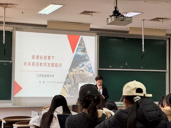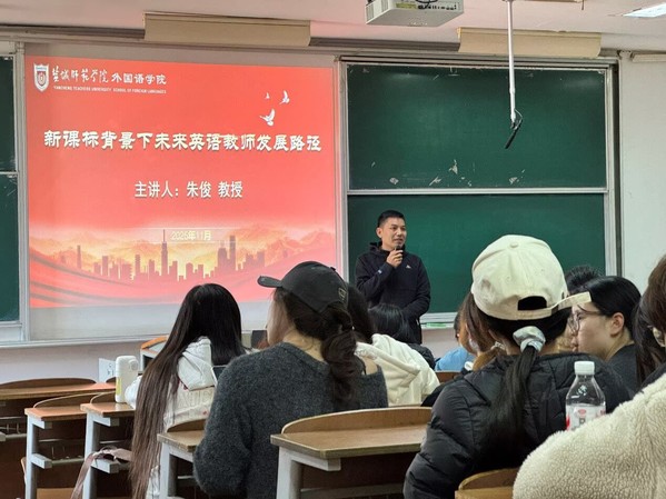 为助力英语师范生明确职业发展方向,提升专业素养与就业竞争力,2025年11月5日,yl1111永利集团特邀江苏省盐城中学朱俊教授对公司2023级所有英语师范生开展“新课标背景下未来英语教师发展路径”专题讲座。